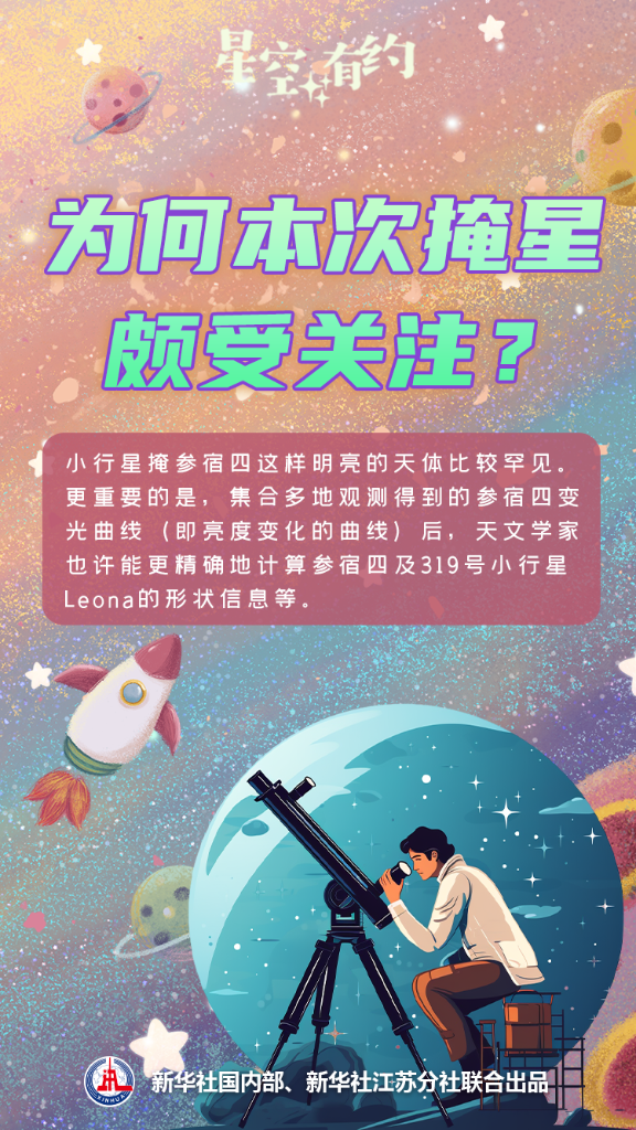 太陽(yáng)系的行星、小行星等在移動(dòng)時(shí),時(shí)常會(huì)掩住遠(yuǎn)處的恒星。不過,小行星掩參宿四這樣明亮的天體比較罕見。“憑肉眼看到參宿四明顯變暗或‘消失’,將會(huì)是一次難得的體驗(yàn)。”王科超介紹說,此次掩星不僅有觀賞性,還具有科學(xué)價(jià)值。集合多地觀測(cè)得到的參宿四變光曲線(即亮度變化的曲線)后,天文學(xué)家也許能更精確地計(jì)算參宿四及319號(hào)小行星Leona的形狀信息等。