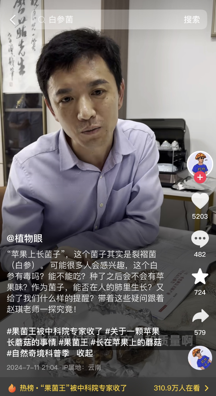 將蘋果長(zhǎng)蘑菇跟網(wǎng)友長(zhǎng)知識(shí)連接起來(lái)的,是涉事科研人員有料且有趣的科普。他們來(lái)得正是時(shí)候的科普,讓此事在“長(zhǎng)菌蘋果”自帶的獵奇色彩和“千里求菌”的戲劇性之外,多了些社會(huì)價(jià)值:在他們順勢(shì)科普前,“長(zhǎng)菌蘋果”留給網(wǎng)友的就是個(gè)“果菌王”的網(wǎng)梗;在他們展開科普后,“長(zhǎng)菌蘋果”讓很多網(wǎng)友頭一次知道了“裂褶菌(又叫白參)”的存在。