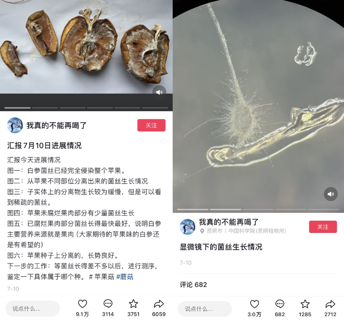 拿到樣本后,許博士對(duì)蘋果做了切片觀察,還在抖音上向網(wǎng)友實(shí)時(shí)更新起了菌絲生長(zhǎng)情況,引發(fā)越來(lái)越多網(wǎng)友的“追更”。之后又有科普創(chuàng)作者@植物眼 專門采訪許博士的導(dǎo)師趙琪,他的細(xì)致講解讓很多網(wǎng)友紛紛表示“又學(xué)到了新知識(shí)”。