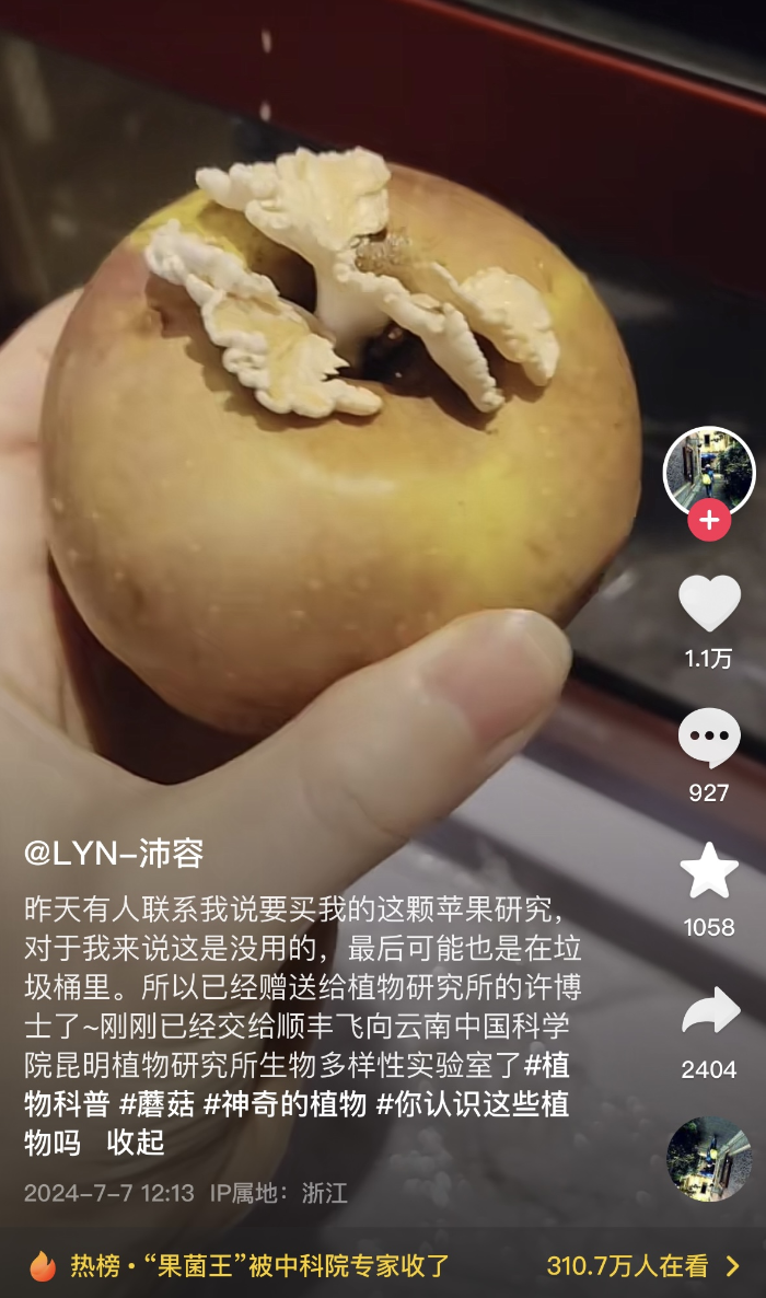 一顆“長(zhǎng)菌蘋果”的奇幻漂流,引發(fā)了媒體聚焦。據(jù)潮新聞報(bào)道,上個(gè)月末,浙江梅雨不斷。浙江德清的鄧小姐發(fā)現(xiàn),家里放了一個(gè)多月的蘋果上,竟長(zhǎng)出了白色的蘑菇。她在抖音上曬出圖片,登上抖音熱榜,那顆“長(zhǎng)菌蘋果”被網(wǎng)友戲稱為“果菌王”。