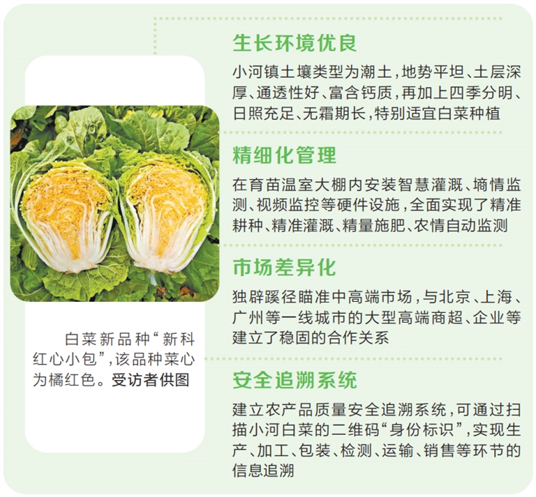 “好的品種培育是種出優(yōu)質(zhì)小河白菜的第一步,科學(xué)育苗則是最為關(guān)鍵的一環(huán)?!睆堒S民介紹,小河白菜賣得貴又賣得好的另一個(gè)重要原因是精細(xì)化管理——通過在育苗溫室大棚內(nèi)安裝智慧灌溉、墑情監(jiān)測(cè)、視頻監(jiān)控等硬件設(shè)施,全面實(shí)現(xiàn)了精準(zhǔn)耕種、精準(zhǔn)灌溉、精量施肥、農(nóng)情自動(dòng)監(jiān)測(cè),進(jìn)而避免白菜干燒心的發(fā)生,提高白菜的產(chǎn)量和品質(zhì)。另外,新鄉(xiāng)市農(nóng)科院大白菜育種團(tuán)隊(duì)也會(huì)對(duì)白菜種植管理提供創(chuàng)新技術(shù)服務(wù),讓公司通過更新品種、科學(xué)管理,從而增加收入。