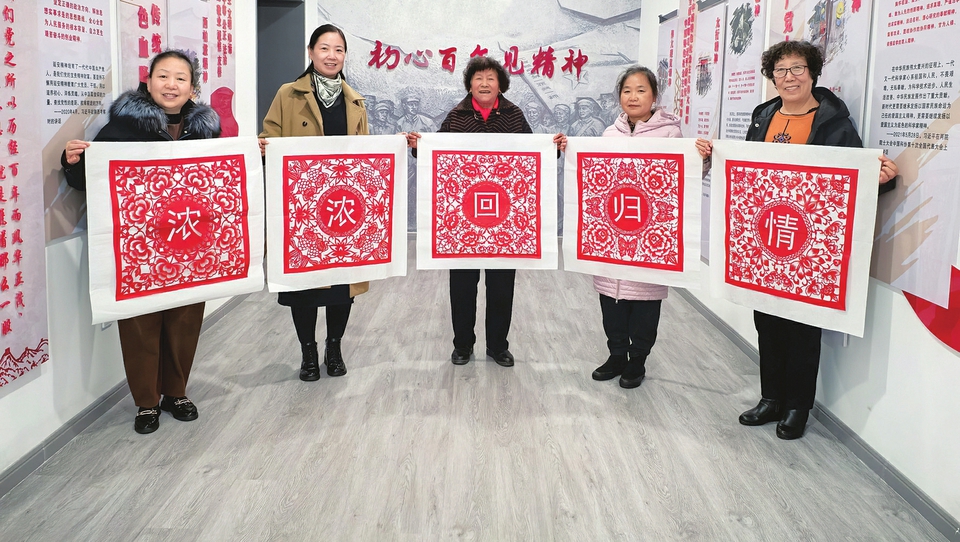 12月17日,陽(yáng)泉市城區(qū)下站街道,陽(yáng)泉市級(jí)非遺傳承人董淑芳(左二)與剪紙愛(ài)好者展示主題剪紙作品。當(dāng)日,下站街道舉辦“濃濃回歸情”主題剪紙活動(dòng),慶祝澳門(mén)回歸祖國(guó)25周年。所展示的剪紙作品圖案有的是澳門(mén)特別行政區(qū)區(qū)花蓮花,有的是象征團(tuán)結(jié)繁榮的牡丹花,還有象征福氣與好運(yùn)的福蝶和象征吉祥富貴的金魚(yú)。一幅幅精美的剪紙作品,表達(dá)了大家濃濃的愛(ài)國(guó)之情。