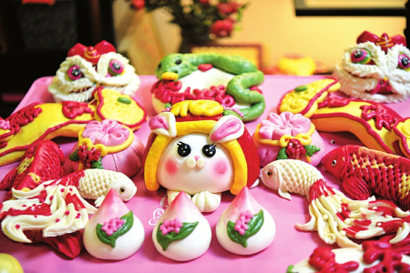 “生肖青蛇臥盤,雙春蛇年生機(jī)盎然;醒獅賀歲,歲歲平安;花開富貴葫蘆,福祿到家;可愛的醒獅兔,蛇盤兔代代富;平安扣青枝上盛開梅花,寓意花開富貴、孕育希望、生機(jī)盎然;可愛福袋,寓意代代有福、福氣滿滿;大紅錦鯉寓意好運(yùn)連連……”馮秀說,今年的花饃圍繞“金蛇送福”這一主題,設(shè)計(jì)了近20個(gè)品種,每款花饃都寓意吉祥和美好祝福。每一款非遺花饃的創(chuàng)意都是基于傳統(tǒng)文化,都是對(duì)傳統(tǒng)文化的致敬,也是人們對(duì)美好生活的期待和向往,“過年買花饃是吃在嘴里的年味兒,充滿了幸福感,我的花饃顧客來自全國各地,有的連續(xù)多年定制,成為了老朋友?!?/p>