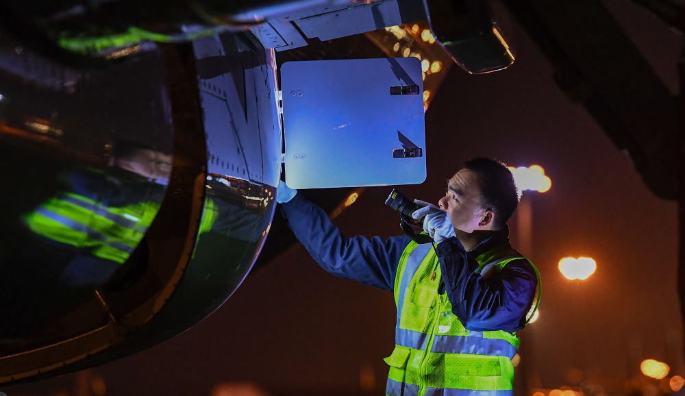 1月11日,在??诿捞m國際機場停機坪上,南航工程技術(shù)分公司機務(wù)工程師對飛機進行深度檢查。新華社記者 楊冠宇 攝
