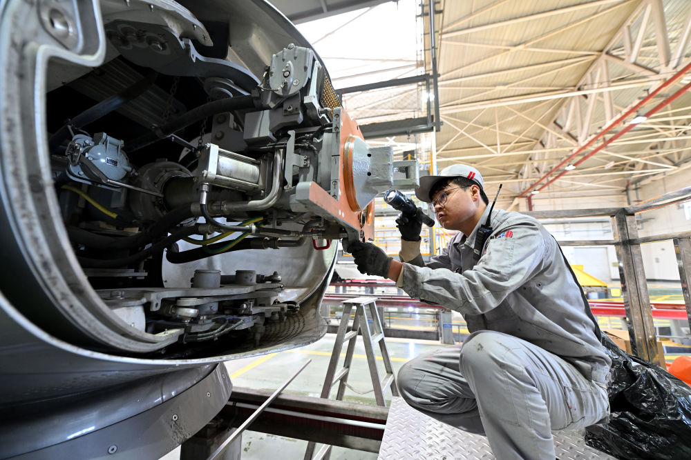 1月9日,在太原動車組運用所,動車組機械師對列車的車頭單元進行檢查維護。新華社記者 詹彥 攝