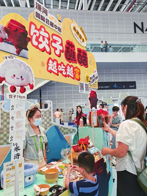 胖乎乎的餃子、圓墩墩的醋缸,摸一摸,毛絨絨的,手感柔順細(xì)滑。8月24日,第七屆山西文博會(huì)現(xiàn)場(chǎng),位于山西瀟河國際會(huì)展中心N4館的文創(chuàng)山西展區(qū),永濟(jì)市晉韻原創(chuàng)文創(chuàng)工作室獨(dú)特而醒目的門頭——“餃子蘸醋 越吃越富”,吸引了眾多參觀者的目光。該工作室展出的餃子蘸醋系列毛絨文創(chuàng)產(chǎn)品,也受到參觀者的關(guān)注和喜愛。