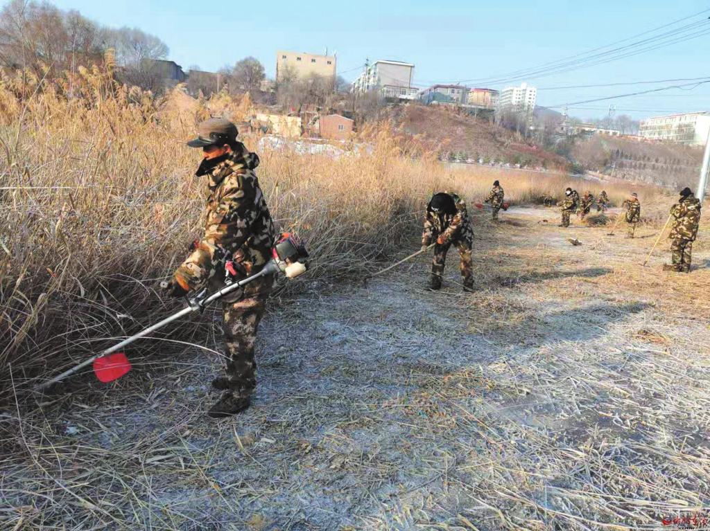 冬季草木干,是防火關(guān)鍵季節(jié)。近期,五臺縣住建局組織人員大面積割除荒草,從根本上消除火災(zāi)隱患。 (金俊賢 攝)