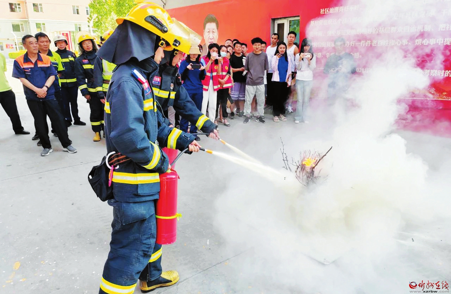 為推進落實消防安全的源頭治理,進一步提升小區(qū)業(yè)主和物業(yè)工作人員的消防安全知識及應對火災突發(fā)事件能力,近日,原平市消防救援大隊聯(lián)合北城街道辦事處在該市迎賓小區(qū)開展消防演練。期間,結(jié)合近年來的高層建筑電氣火災案例,消防人員對火場疏散逃生的基本常識、火災的應急和預防、消防器材的使用方法進行講解,引導小區(qū)物業(yè)工作人員和業(yè)主拿起滅火器進行實際操作,切實了解和掌握滅火器的正確使用方法,進一步增強轄區(qū)群眾應急防范能力和安全意識。圖為正確使用滅火器演示現(xiàn)場。(劉 強攝)