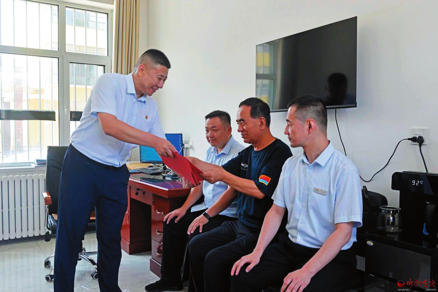 “八一”節(jié)前夕,河曲農(nóng)商銀行負責(zé)人走進唐家會支行走訪慰問在一線工作的退役軍人員工郭文毅、劉躍、左貴才,向他們送去慰問金,并致以節(jié)日的美好祝福和誠摯問候。希望他們永葆退伍不退志、退役不褪色的政治本色。(左航愷 攝)
