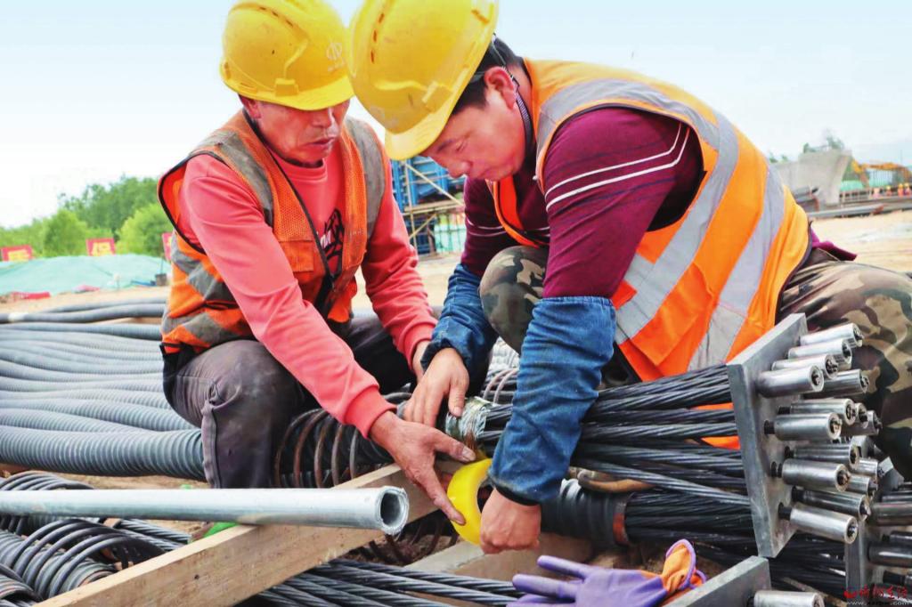 記者近日走進(jìn)南北通道菱形立交橋工地,只見(jiàn)密密匝匝的鋼筋林立如網(wǎng),奮戰(zhàn)在太忻大道一線的工人們頂烈日、冒酷暑、戰(zhàn)高溫,汗流浹背、干勁不減。技術(shù)員仔細(xì)檢查著每一個(gè)接口、鋼筋工熟練準(zhǔn)確排布每一組鋼筋結(jié)構(gòu),井然有序,規(guī)范自如?!澳媳蓖ǖ懒庑瘟⒔粯蚬こ淌琼?xiàng)目中兩處混凝土澆筑工程之一,目前工程前期準(zhǔn)備工作已接近尾聲,全部澆筑工程任務(wù)將在9月10日前完成?!表?xiàng)目一隊(duì)負(fù)責(zé)人尹耀軍自信滿滿。