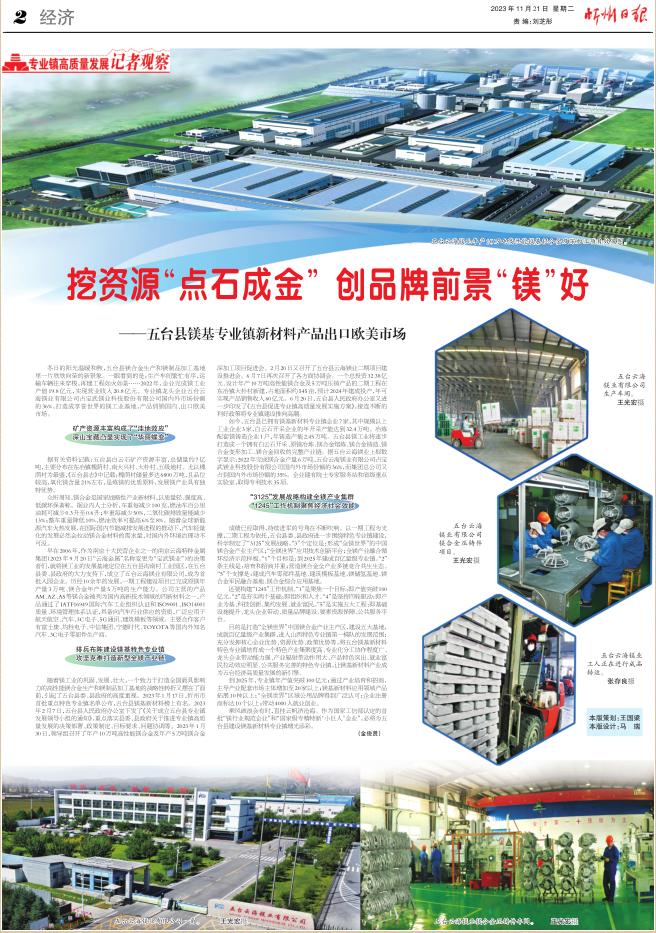 今年1月17日,忻州市公布了首批重點特色專業(yè)鎮(zhèn)名單,五臺縣鎂基新材料特色專業(yè)鎮(zhèn)榜上有名。1月30日,五臺縣委、縣政府召開了年產(chǎn)10萬噸高性能鎂合金及年產(chǎn)5萬噸鎂合金深加工項目促進會,二期項目總投資32.38億元,預(yù)計2024年建成投產(chǎn),年可實現(xiàn)產(chǎn)品銷售收入60億元。6月20日,五臺縣政府辦公室印發(fā)了《五臺縣促進專業(yè)鎮(zhèn)高質(zhì)量發(fā)展實施方案》,將專業(yè)鎮(zhèn)建設(shè)推向高潮。五臺鎂基新材料特色專業(yè)鎮(zhèn)現(xiàn)有7家企業(yè),其中規(guī)模以上工業(yè)企業(yè)3家,白云石開采企業(yè)年開采產(chǎn)能32.4萬噸;冶煉配套鎂鑄造企業(yè)1戶,年鑄造產(chǎn)能2.45萬噸。