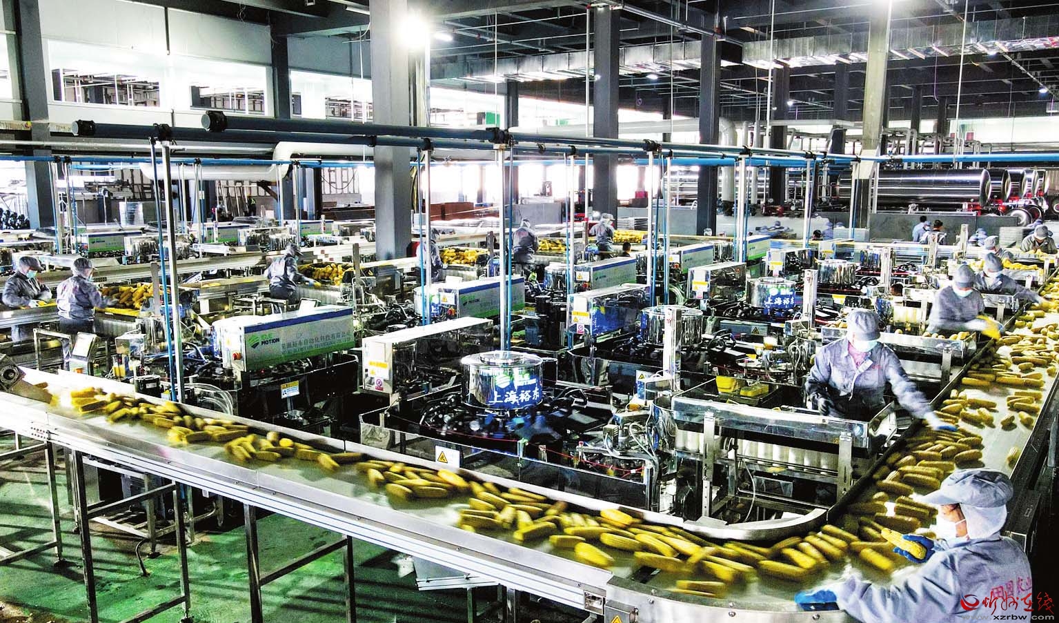 總占地面積約100畝的五寨縣甜糯玉米產(chǎn)業(yè)園,坐落于五寨縣的國家農(nóng)村產(chǎn)業(yè)融合發(fā)展示范園。園內(nèi)采用國內(nèi)先進(jìn)的生產(chǎn)工藝,從機(jī)器去皮、切梗去尖、巴氏滅菌、真空包裝到速凍隧道、智能庫房等,實(shí)現(xiàn)去皮、切頭、清洗、分級、殺菌、蒸煮、包裝的全流程機(jī)械化自動化,極大地提高了加工效率,每小時(shí)可加工甜糯玉米27萬穗,最大限度保留了玉米的色、香、味和營養(yǎng)成分。