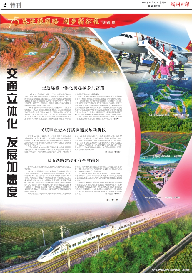 2024年,全市三個一號旅游公路建設(shè)里程為253公里,目標(biāo)完成投資16.8億元,目前完成投資16.4億元,已實現(xiàn)全線建成貫通;新改建農(nóng)村公路目標(biāo)為445公里,目標(biāo)完成投資10億元,截至目前,已完成390公里,完成投資7.9億元,預(yù)計年底全部完工。這些目標(biāo)任務(wù)的實現(xiàn),為我市實現(xiàn)鄉(xiāng)村全面振興和加快交通、旅游、現(xiàn)代服務(wù)業(yè)融合發(fā)展,加快“城景通、景景通、城鄉(xiāng)通”建設(shè)提供了強(qiáng)有力的支撐和保障。
