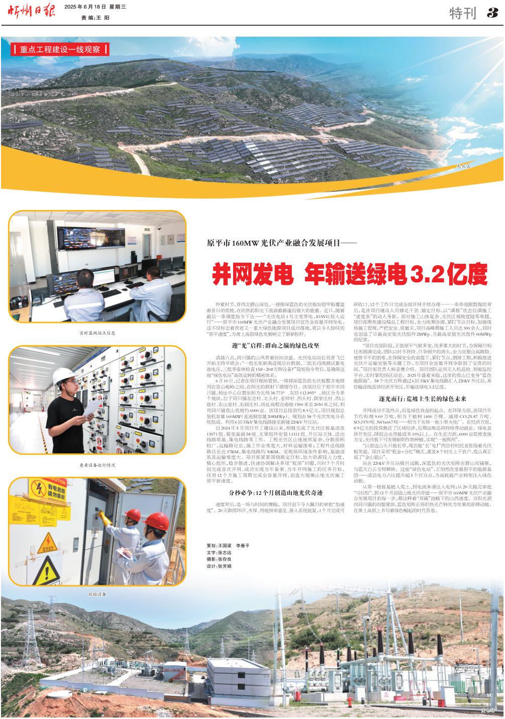 “項(xiàng)目攻堅(jiān)階段,正值原平氣候多變,雨多霧大的時(shí)節(jié),為保障目標(biāo)任務(wù)圓滿完成,團(tuán)隊(duì)以時(shí)不我待、只爭(zhēng)朝夕的勁頭,全力克服山高路險(xiǎn)、地勢(shì)不平的困難,在保障安全的前提下,緊盯節(jié)點(diǎn),倒排工期,積極推進(jìn)光伏片運(yùn)輸安裝等關(guān)鍵工作,為項(xiàng)目全容量并網(wǎng)爭(zhēng)取到了寶貴的時(shí)間?!表?xiàng)目部負(fù)責(zé)人楊亞賽介紹。項(xiàng)目團(tuán)隊(duì)運(yùn)用無(wú)人機(jī)巡檢、智能監(jiān)控平臺(tái),實(shí)時(shí)掌控場(chǎng)區(qū)動(dòng)態(tài)。2025年盛夏來(lái)臨,這里的荒山已變身“藍(lán)色能源海”。58個(gè)光伏方陣通過(guò)6回35kV集電線路匯入220kV升壓站,再經(jīng)輸送線直供經(jīng)濟(jì)開(kāi)發(fā)區(qū),年輸送綠電3.2億度。