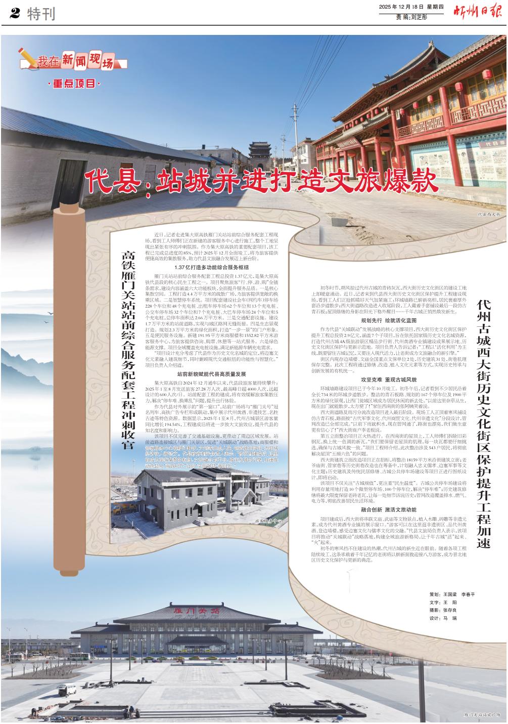 高鐵雁門(mén)關(guān)站站前綜合服務(wù)配套工程沖刺收官 近日,記者走進(jìn)集大原高鐵雁門(mén)關(guān)站站前綜合服務(wù)配套工程現(xiàn)場(chǎng),看到工人師傅們正在新建的游客服務(wù)中心進(jìn)行施工,整個(gè)工地呈現(xiàn)出緊張有序的沖刺氛圍。作為集大原高鐵的重要配套項(xiàng)目,該工程已完成總進(jìn)度的85%,預(yù)計(jì)2025年12月全面竣工,將為旅客提供便捷高效的集散服務(wù),助力代縣文旅融合發(fā)展邁上新臺(tái)階。 1.37億打造多功能綜合服務(wù)樞紐 雁門(mén)關(guān)站站前綜合服務(wù)配套工程總投資1.37億元,是集大原高鐵代縣段的核心民生工程之一。項(xiàng)目聚焦旅客“行、停、游、購(gòu)”全鏈條需求,建設(shè)內(nèi)容涵蓋六大功能板塊,全面提升服務(wù)品質(zhì)。一是核心集散空間。工程打造4.4萬(wàn)平方米的疏散廣場(chǎng),為旅客提供寬敞的換乘區(qū)域。二是智慧停車(chē)系統(tǒng)。項(xiàng)目配套建設(shè)社會(huì)車(chē)(網(wǎng)約車(chē))停車(chē)場(chǎng)228個(gè)車(chē)位和48個(gè)充電樁、出租車(chē)停車(chē)場(chǎng)62個(gè)車(chē)位和13個(gè)充電樁、公交車(chē)停車(chē)場(chǎng)32個(gè)車(chē)位和7個(gè)充電樁、大巴車(chē)停車(chē)場(chǎng)24個(gè)車(chē)位和5個(gè)充電樁,總停車(chē)面積達(dá)2.66萬(wàn)平方米。三是交通配套設(shè)施。建設(shè)1.7萬(wàn)平方米的站前道路,實(shí)現(xiàn)與城區(qū)路網(wǎng)無(wú)縫銜接。四是生態(tài)景觀(guān)打造。規(guī)劃2.3萬(wàn)平方米的綠化面積,打造“一步一景”的門(mén)戶(hù)形象。五是便民服務(wù)設(shè)施。新建191.95平方米商服樓和1552.82平方米游客服務(wù)中心,為旅客提供咨詢(xún)、購(gòu)票、休憩等一站式服務(wù)。六是綠色能源支撐。項(xiàng)目全域覆蓋充電樁設(shè)施,滿(mǎn)足新能源車(chē)輛充電需求。 “項(xiàng)目設(shè)計(jì)充分考慮了代縣作為歷史文化名城的定位,將邊塞文化元素融入建筑細(xì)節(jié),同時(shí)兼顧現(xiàn)代交通樞紐的功能性與智慧化?!表?xiàng)目負(fù)責(zé)人介紹道。 站前新貌賦能代縣高質(zhì)量發(fā)展 集大原高鐵自2024年12月通車(chē)以來(lái),代縣段旅客量持續(xù)攀升:2025年1至8月發(fā)送旅客27.28萬(wàn)人次,最高峰日超4000人次,遠(yuǎn)超設(shè)計(jì)的600人次/日。站前配套工程的建成,將有效緩解旅客集散壓力,解決“停車(chē)難、換乘亂”問(wèn)題,提升出行體驗(yàn)。 作為代縣對(duì)外展示的“第一窗口”,站前廣場(chǎng)將與“雁門(mén)關(guān)號(hào)”冠名列車(chē)、高鐵廣告專(zhuān)欄形成聯(lián)動(dòng),集中展示代州黃酒、非遺技藝、名勝古跡等特色資源。數(shù)據(jù)顯示,2025年1至8月,代州古城景區(qū)游客量同比增長(zhǎng)194.54%,工程建成后將進(jìn)一步放大文旅效應(yīng),提升代縣的知名度和影響力。 該項(xiàng)目不僅完善了交通基礎(chǔ)設(shè)施,更帶動(dòng)了周邊區(qū)域發(fā)展。站前道路連接城區(qū)與雁門(mén)關(guān)景區(qū),促進(jìn)“關(guān)城聯(lián)動(dòng)”戰(zhàn)略落地;商服樓和游客服務(wù)中心將吸引餐飲、文創(chuàng)等業(yè)態(tài)入駐,創(chuàng)造就業(yè)崗位,為縣域經(jīng)濟(jì)注入新活力。代縣政府相關(guān)負(fù)責(zé)人表示:“該項(xiàng)目建成后,這里將成為旅客集散的樞紐、文旅融合的平臺(tái)、城市發(fā)展的引擎,加速推動(dòng)我縣從‘高鐵時(shí)代’邁向‘文旅強(qiáng)縣’新時(shí)代?!?/p> 代州古城西大街歷史文化街區(qū)保護(hù)提升工程加速 初冬時(shí)節(jié),朔風(fēng)掠過(guò)代州古城的青磚灰瓦,西大街歷史文化街區(qū)的建設(shè)工地上卻暖意涌動(dòng)。近日,記者來(lái)到代縣西大街歷史文化街區(qū)保護(hù)提升工程建設(shè)現(xiàn)場(chǎng),看到工人們正搶抓晴好天氣加緊施工:環(huán)城墻路已嶄新亮相,居民裹著厚外套沿步道散步;西大街道路改造進(jìn)入收尾階段,工人戴著手套鋪設(shè)最后一段仿古青石板;屋頂修繕的身影在陽(yáng)光下格外醒目……千年古城正悄然煥發(fā)新生。 規(guī)劃先行繪就活化藍(lán)圖 作為代縣“關(guān)城聯(lián)動(dòng)”發(fā)展戰(zhàn)略的核心支撐項(xiàng)目,西大街歷史文化街區(qū)保護(hù)提升工程總投資2.9億元,涵蓋7個(gè)子項(xiàng)目,旨在依托國(guó)家級(jí)歷史文化名城資源,打造代州古城4A級(jí)旅游景區(qū)精品步行街、代州黃酒專(zhuān)業(yè)鎮(zhèn)建設(shè)成果展示地、歷史文化街區(qū)保護(hù)與更新示范地。項(xiàng)目負(fù)責(zé)人告訴記者:“工程以‘活化利用’為主線(xiàn),既要留住古城記憶,又要注入現(xiàn)代活力,讓老街成為文旅融合的新引擎?!?/p> 街區(qū)內(nèi)現(xiàn)存邊靖樓、文廟全國(guó)重點(diǎn)文保單位2處,歷史建筑31處,街巷肌理保存完整。此次工程將通過(guò)修繕、改造、植入文化元素等方式,實(shí)現(xiàn)歷史傳承與創(chuàng)新發(fā)展的有機(jī)統(tǒng)一。 攻堅(jiān)克難重現(xiàn)古城風(fēng)貌 環(huán)城墻路建設(shè)項(xiàng)目已于今年10月竣工。初冬午后,記者看到不少居民沿著全長(zhǎng)734米的環(huán)城步道散步。整潔的青石板路、規(guī)劃的167個(gè)停車(chē)位及1900平方米的綠化景觀(guān),讓西門(mén)