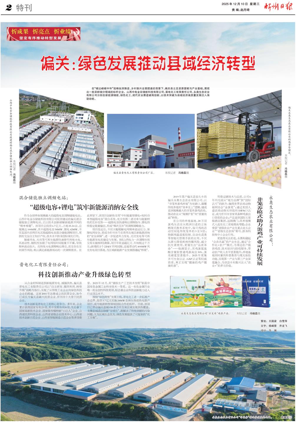 在“碳達(dá)峰碳中和”戰(zhàn)略縱深推進(jìn)、鄉(xiāng)村振興全面提速的背景下,偏關(guān)縣立足資源稟賦與產(chǎn)業(yè)基礎(chǔ),涌現(xiàn)出一批深耕細(xì)分領(lǐng)域的標(biāo)桿企業(yè)。山西中電金谷儲能科技有限公司、晉電化工有限責(zé)任公司、永奧生態(tài)農(nóng)業(yè)有限公司分別在新能源儲能、綠色化工、現(xiàn)代農(nóng)業(yè)賽道破局創(chuàng)新,以技術(shù)突破為縣域經(jīng)濟(jì)高質(zhì)量發(fā)展注入強(qiáng)勁動能。