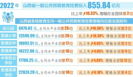 本報(bào)訊(記者任志霞)日前,教育部、國家統(tǒng)計(jì)局、財(cái)政部發(fā)布了2022年全國教育經(jīng)費(fèi)執(zhí)行情況統(tǒng)計(jì)公告(以下簡稱統(tǒng)計(jì)公告)。統(tǒng)計(jì)公告顯示,2022年山西省一般公共預(yù)算教育經(jīng)費(fèi)投入855.84億元,比上年增長10.33%,增幅在全國排第2位。