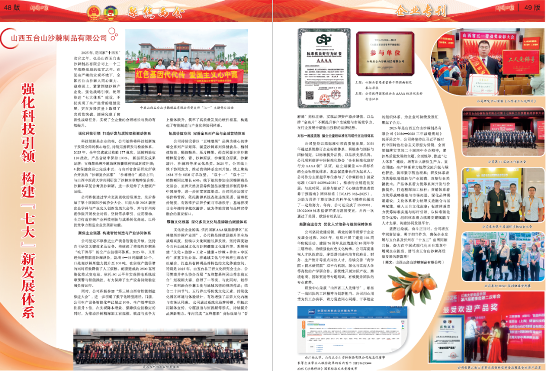 2025年,是國家“十四五”收官之年,也是山西五臺山沙棘制品有限公司上一個三年戰(zhàn)略規(guī)劃的收官之年。在復雜嚴峻的宏觀環(huán)境下,全體五臺山沙棘人同心聚力、迎難而上,緊緊圍繞沙棘產(chǎn)業(yè)化,強化戰(zhàn)略引領,統(tǒng)籌推進“七大體系”建設,不僅實現(xiàn)了生產(chǎn)經(jīng)營的穩(wěn)健發(fā)展,更在發(fā)展質(zhì)量上取得了實質(zhì)性突破,圓滿完成了階段性戰(zhàn)略任務,實現(xiàn)了企業(yè)量的合理增長與質(zhì)的有效提升。