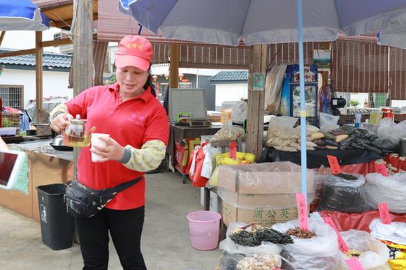 “天太熱,來喝口我這免費(fèi)的茶?!辈湃脒B樟村村口,記者便被熱情的村民陸秀媚招呼到了自己的攤位。紅茶、本地枝葉、山柑皮、筍干……她的攤位琳瑯滿目,擺得滿滿當(dāng)當(dāng)。陸秀媚告訴記者,自己曾經(jīng)在市里賣童裝,剛開始還能掙到些錢,后來隨著網(wǎng)購興起,實(shí)體店的生意越來越難做。2018年,在習(xí)近平總書記來連樟村視察后,看到家鄉(xiāng)越變越好,陸秀媚選擇了回到村里創(chuàng)業(yè)。