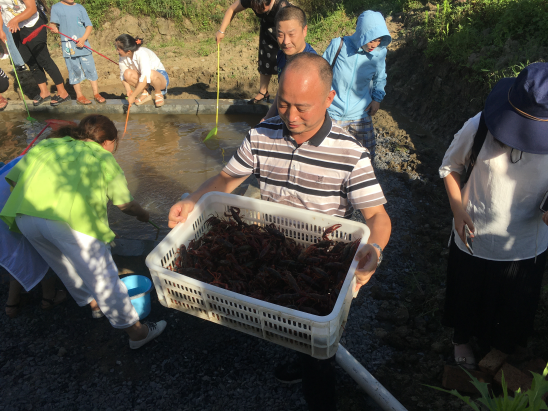 在郴州市吳山村小龍蝦養(yǎng)殖基地,一群游客圍在一個(gè)養(yǎng)蝦池邊歡笑不斷,不時(shí)響起一聲聲驚喜的尖叫,這里正在進(jìn)行一場(chǎng)“釣蝦大賽”。