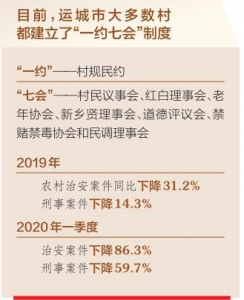 目前,運(yùn)城市大多數(shù)村都建立了“一約七會(huì)”制度——“一約”是村規(guī)民約,“七會(huì)”是村民議事會(huì)、紅白理事會(huì)、老年協(xié)會(huì)、新鄉(xiāng)賢理事會(huì)、道德評(píng)議會(huì)、禁賭禁毒協(xié)會(huì)和民調(diào)理事會(huì)。這“一約七會(huì)”制度的不斷健全,對(duì)破除鄉(xiāng)村社會(huì)陋習(xí)、引導(dǎo)群眾移風(fēng)易俗、引領(lǐng)社會(huì)新風(fēng)、化解矛盾糾紛,維護(hù)基層社會(huì)和諧穩(wěn)定起到了重要作用。村民的正能量多了,鄉(xiāng)村的負(fù)面事情少了,社會(huì)治安狀況得到明顯改善,群眾安全感顯著增強(qiáng)。2019年運(yùn)城市農(nóng)村治安案件同比下降31.2%,刑事案件下降14.3%;2020年一季度,治安案件下降86.3%,刑事案件下降59.7%。