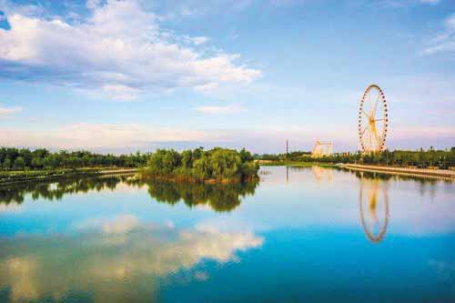 沿著河岸邊的石板路緩緩向西前行,手中撫過岸邊的花崗石欄桿,偶有微風(fēng)拂面,帶起耳畔凌亂的發(fā)絲,讓人頓覺神清氣爽,想要沉醉在眼前的迷人風(fēng)光中。這時(shí),不遠(yuǎn)處忽然傳來人們的歡呼聲和尖叫聲,我上前一看,原來已經(jīng)走到了云中河游樂園。游樂園里的娛樂項(xiàng)目多樣,其中最醒目的便是那高達(dá)88米、修建時(shí)高度居山西第一的摩天輪,伴隨著悅耳的歌謠,摩天輪緩緩地轉(zhuǎn)動(dòng)著,帶著人們對浪漫的遐想。