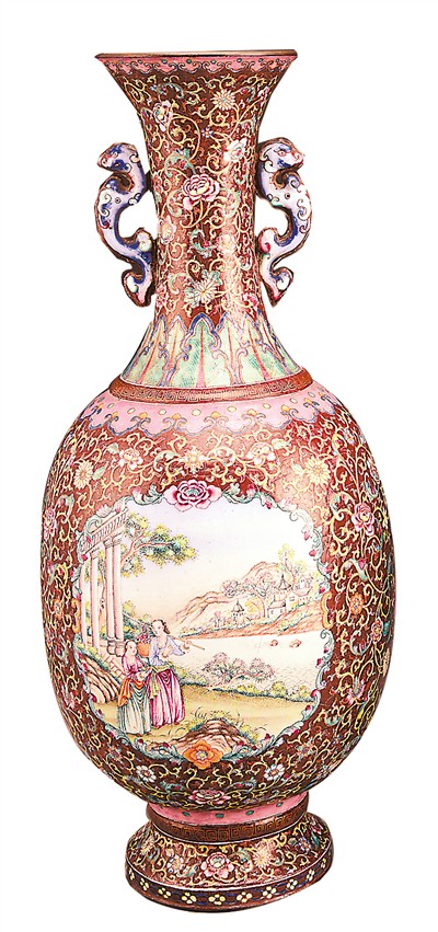 清代廣州畫(huà)琺瑯纏枝花卉山水人物紋雙耳瓶