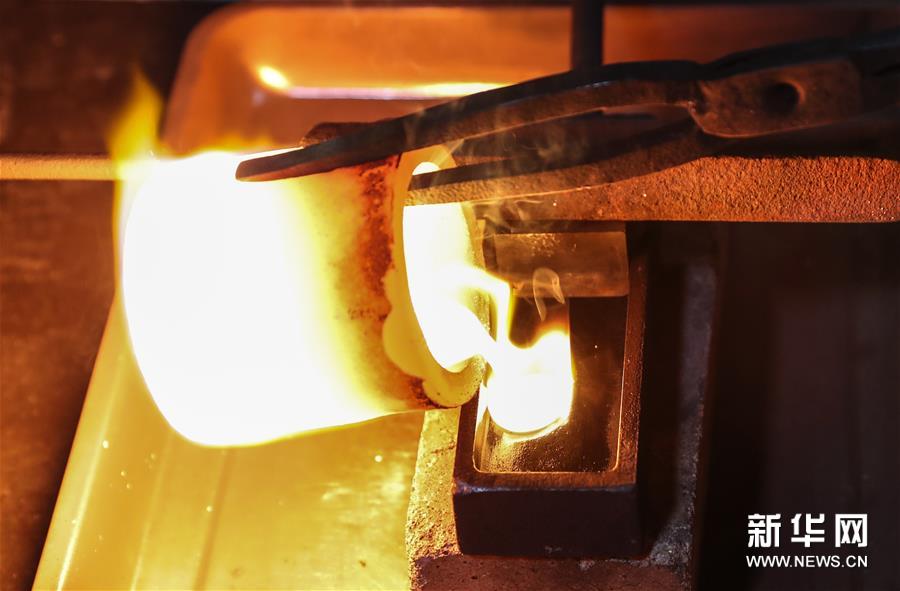 在南京金線金箔總廠,工人將熔化的金水倒入容器(2019年12月12日攝)。68歲的王必生是江蘇南京人,1973年進(jìn)入南京金箔鍛制技藝項(xiàng)目保護(hù)單位——南京金線金箔總廠,師從老藝人譚柱石,他虛心學(xué)習(xí),潛心鉆研,很快掌握打金箔的技藝。他致力于技術(shù)革新和改造,參與機(jī)械打箔機(jī)、自動(dòng)打箔機(jī)的研制。2009年他被評(píng)為國(guó)家級(jí)非物質(zhì)文化遺產(chǎn)項(xiàng)目南京金箔鍛制技藝代表性傳承人。 金箔鍛制技藝,俗稱“打金箔”,歷史悠久。在南京一些地方,金箔生產(chǎn)仍然延用古代傳下的制作工序,鍛制過(guò)程包括化金條、拍葉、做捻子、沾捻子、打開子、裝開子、出具、切箔等。 金箔廣泛應(yīng)用于建筑裝飾,還可應(yīng)用于雕塑、工藝品、書畫、食品藥品、服飾等方面的貼金裝飾和制作。南京金箔品種有真金箔、銅箔、銀箔、鋁箔,薄如蟬翼、色澤純正、厚薄均勻,產(chǎn)品銷往海內(nèi)外。 目前,王必生所在的南京金線金箔總廠是國(guó)家級(jí)非物質(zhì)文化遺產(chǎn)代表性項(xiàng)目保護(hù)單位。工廠把人工打金箔的遺址保護(hù)起來(lái),并成立了金箔大師工作室,加強(qiáng)金箔技藝的推廣,加大傳承人的培養(yǎng)力度。已經(jīng)退休的王必生被工廠返聘,負(fù)責(zé)打箔技藝展示和傳承。他說(shuō),現(xiàn)在機(jī)器打箔越來(lái)越多,但人工打出的金箔的更加柔軟,齊整。他希望這一傳統(tǒng)技藝能夠繼續(xù)傳承下去。新華社記者 楊磊 攝