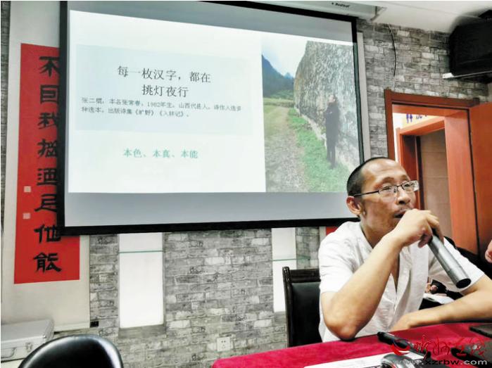 本報(bào)訊 8月15日晚,位于忻州市七一北路的好目匠眼鏡店迎來一場(chǎng)文學(xué)盛會(huì)。保德縣、岢嵐縣、五寨縣、原平市、定襄縣的詩(shī)歌愛好者,與忻州城區(qū)的詩(shī)歌愛好者一起聆聽了著名詩(shī)人張二棍關(guān)于詩(shī)歌創(chuàng)作的講座,甚至有詩(shī)歌愛好者專門從北京趕回忻州。當(dāng)晚,連講座廳外都站滿了聆聽的人。