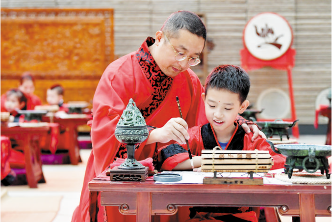 9月13日,一場(chǎng)漢服“開(kāi)筆禮”在西安大唐西市博物館舉行,多名孩童著漢服,行漢禮,通過(guò)“朱砂開(kāi)智”“啟蒙描紅”等環(huán)節(jié)體驗(yàn)中國(guó)傳統(tǒng)文化。圖為家長(zhǎng)帶領(lǐng)孩子一起進(jìn)行“啟蒙描紅”。 新華社記者 劉瀟 攝