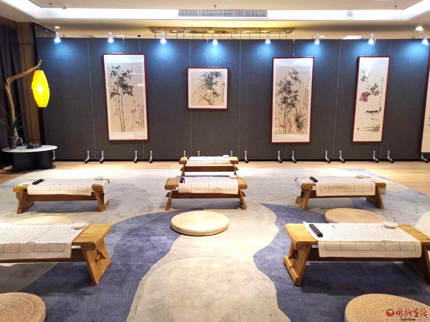 繞過木架綠植,穿行于鋪陳有字貼宣紙的書案,現(xiàn)場彈奏的琵琶古韻從耳畔飄過,茶香伴著墨香沁人心脾。你可以駐足細(xì)品這些書畫的精微高超之處,你可以圍桌而坐品茗閑談,興起時你還可以搖管潑墨揮灑一番……