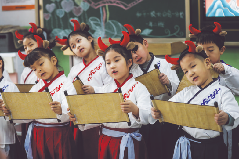 3月1日,全國(guó)多地中小學(xué)開(kāi)學(xué)。學(xué)生們?cè)谛问蕉鄻拥拈_(kāi)學(xué)第一課中迎來(lái)了新的學(xué)期。圖為遼寧省沈陽(yáng)市和平一校長(zhǎng)白島一分校1年級(jí)2班的學(xué)生在上開(kāi)學(xué)第一課,學(xué)生代表進(jìn)行了傳統(tǒng)文化節(jié)目表演。 新華社記者 潘昱龍 攝