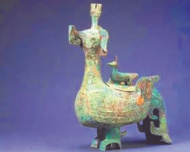 第二件是北京保利藝術(shù)博物館從海外購(gòu)回、2004年曾名噪一時(shí)的“倗季鳳鳥(niǎo)尊”。它也是一只昂首挺立的鳳鳥(niǎo)形象,鳳鳥(niǎo)背部挺立一只小鳥(niǎo)。蓋內(nèi)側(cè)有銘文“倗季乍祖考寶彝”。2005年“中國(guó)十大考古新發(fā)現(xiàn)”山西絳縣橫水墓地的發(fā)掘和研究,證實(shí)了古倗國(guó)就在山西南部。那么,“倗季鳳鳥(niǎo)尊”的出土地也應(yīng)該是山西無(wú)疑了。