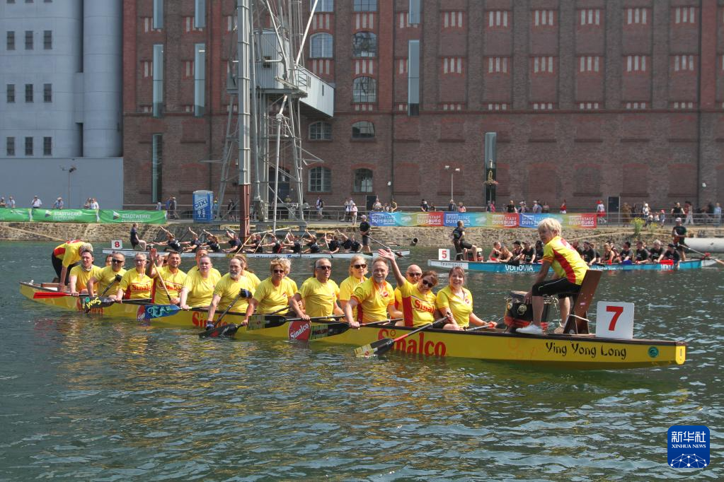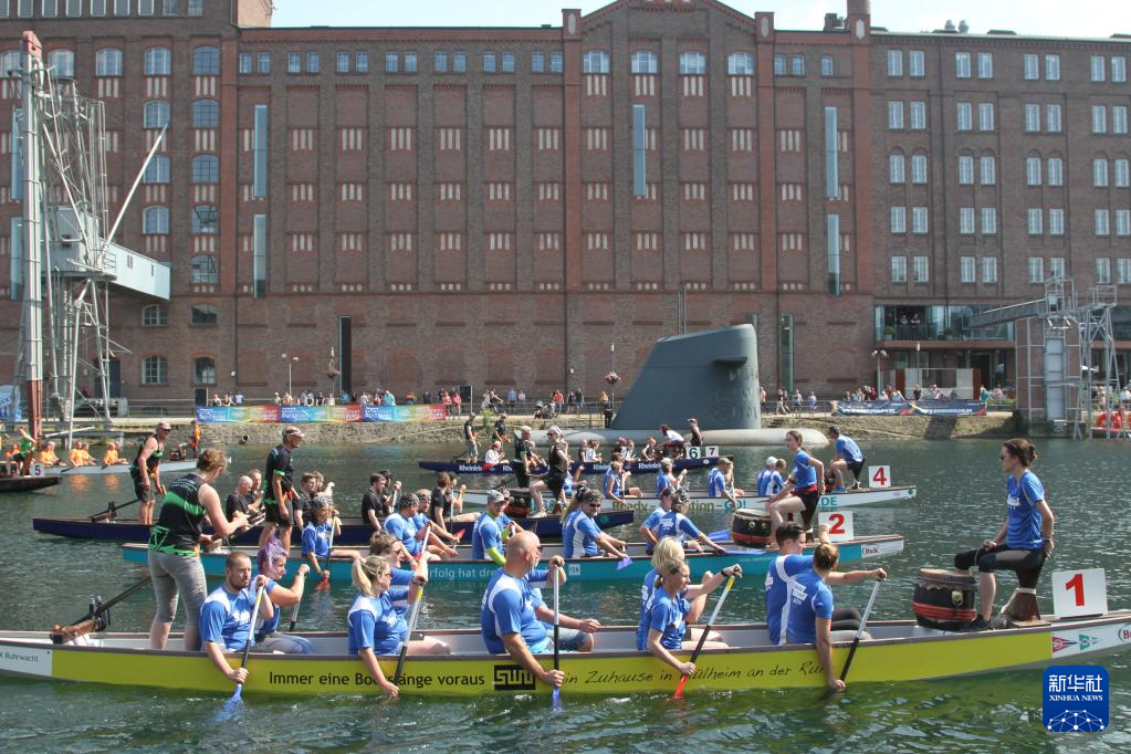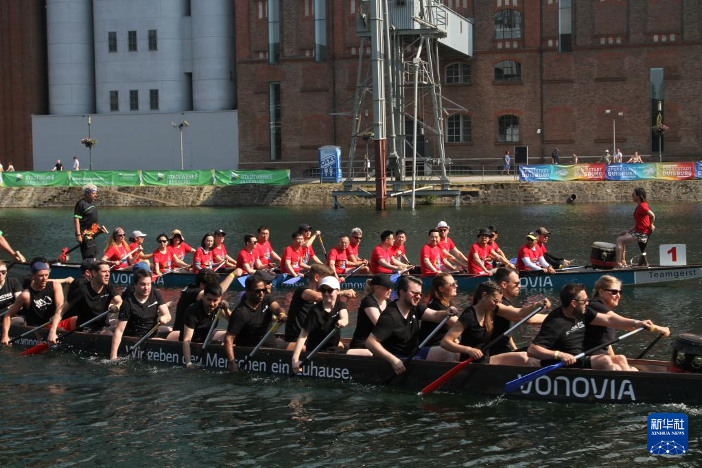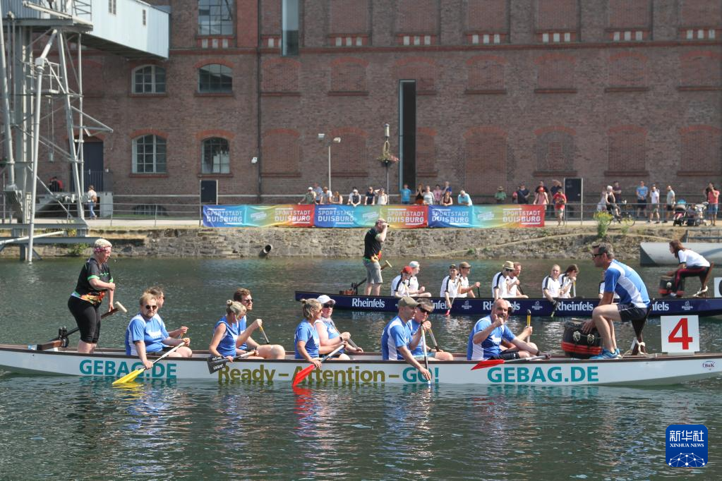 6月10日,人們在德國杜伊斯堡參加趣味龍舟賽。新華社記者 單瑋怡 攝?