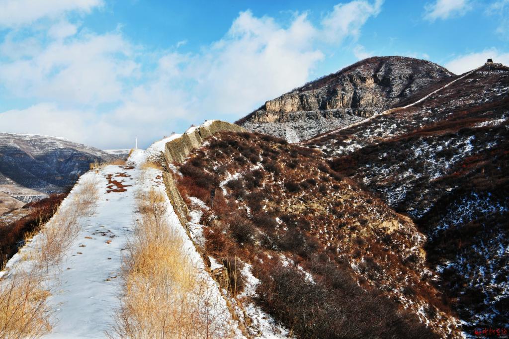 另一道長城是這樣的:史書上記載的宋長城出發(fā)地是草城川口天澗堡,實地中的草城川現(xiàn)在叫北川河,天澗堡古代可能有堡墻,如沒有,不可能有“川口有古城”的記載,可能歷經(jīng)千余年風雨被河水沖刷掉了,現(xiàn)在堡墻已不太明顯但有古文化層遺跡,還有兩座規(guī)模較大的烽火臺。長城從此出發(fā),向東爬上陡坡,順著一道山洼上到山頂。在山頂走了一公里余就與從興縣西來的北齊、隋修筑的早期長城匯合,在陡峭的山頂上形成一個完美的“岢嵐結(jié)”,也就是俗話中的“二把叉”形狀。這段宋代獨立修筑的長城大約有3公里。