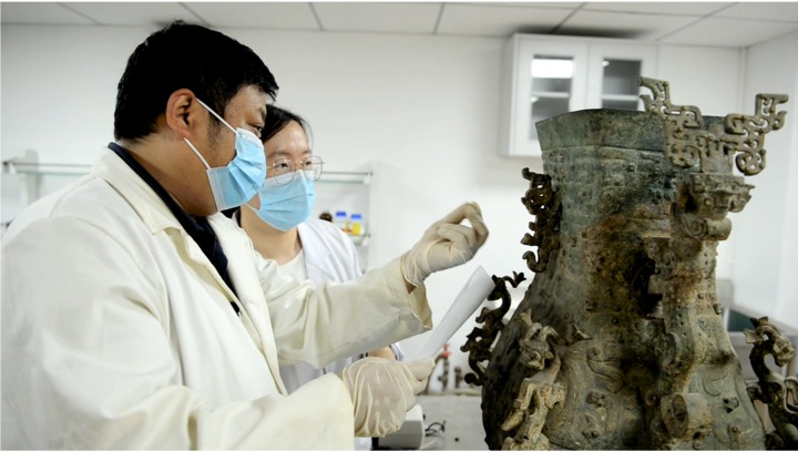 此外,為了堅持“最小干預(yù)”原則,保證文物真實(shí)性,此次修復(fù)并沒有對蓮鶴方壺進(jìn)行統(tǒng)一著色?!拔覀冎厍謇砹擞泻︿P,而記錄著文物信息的無害銹得到原汁原味保留,紅斑處留紅,綠銹處存綠,保留文物的歷史信息?!倍虐舱f。