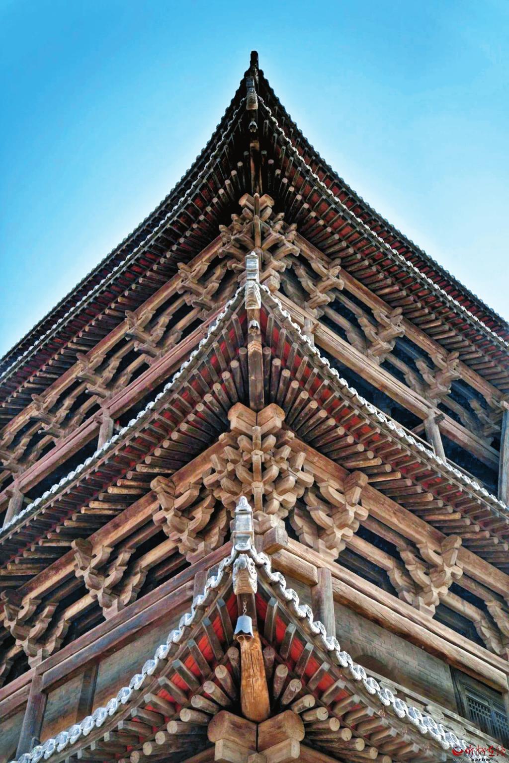 檐下結構,底層回廊無斗拱,回廊柱頭以檁墊枋三件和單步梁外端的單浮云相交承挑檐檁,其余各層檐下皆有層層疊架的斗拱承托檐桁。