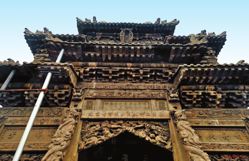 主坊位于原平市大牛店鎮(zhèn)陽(yáng)武村,據(jù)記載,始建于清咸豐五年(公元1855年),坐東朝西,四柱三樓,重檐歇山頂,通高10.54米,通面寬15米,建于高0.94米的束腰須彌座上,束腰部雕有各種人物故事圖,正面雕有四個(gè)力士。額枋下四柱為方形霸王柱,前后有戧柱支撐。戧柱上有螭首纏繞。明樓略寬,兩次樓稍窄。明樓雀替上鏤雕有二龍戲珠圖,上置額枋及樓匾,分別署“咸豐五年九月男武訪(fǎng)疇謹(jǐn)建”“旌表資政大夫庠生武烈之妻朱氏節(jié)孝坊”。兩次樓雀替上鏤雕丹鳳朝陽(yáng),額枋上分別署“柏舟矢志”“竹帛流芳”,上下枋均雕有二十四孝圖、人物故事及花鳥(niǎo)走獸等圖案。下層檐仿木構(gòu)石雕斗拱,五踩重翹,上層檐仿木構(gòu)石雕斗拱,三踩單翹。坊前設(shè)有石雕、旗桿各一對(duì)。配坊坐北朝南,四柱三門(mén),單檐歇山頂。牌樓石刻神獸、人物、楹聯(lián)。1982年維修。1965年公布為省級(jí)文物保護(hù)單位。2019年入選全國(guó)第八批國(guó)家級(jí)保護(hù)單位。