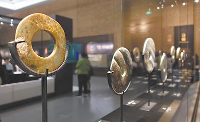 良渚博物院坐落在浙江杭州市余杭區(qū)美麗洲公園內(nèi),是全面展示良渚文化的考古遺址博物館。圖為良渚遺址出土的玉器。