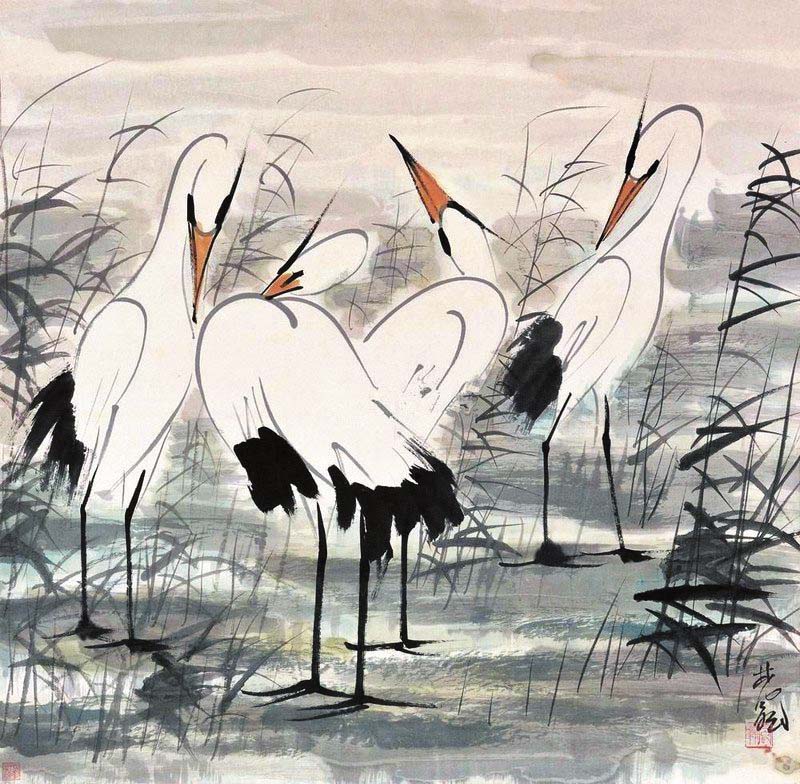 到了近現(xiàn)代,傳統(tǒng)文藝思想開始發(fā)生轉(zhuǎn)變,呂澂、康有為等人在繪畫領(lǐng)域提出改良思想,鶴主題的繪畫也有所變化。在林風(fēng)眠創(chuàng)作的《群鶴圖》《雙鶴圖》《白鶴》等作品中,既可以看到中國(guó)畫白描的影子,又可以感受到西方速寫技法的影響?!度胡Q圖》由幾只立于廣袤水草的白鶴構(gòu)成,它們姿態(tài)各不相同。與鶴之閑適姿態(tài)相對(duì)應(yīng)的是隨風(fēng)浮動(dòng)的蘆葦,它們?cè)谖L(fēng)吹拂下雖形態(tài)萬(wàn)千,但并不雜亂,在總體偏暗的色調(diào)中顯出和諧之味?!峨p鶴圖》表現(xiàn)了鶴的輕盈姿態(tài),兩只鶴步伐保持一致,展示出閑適自得之感。林風(fēng)眠筆下的鶴,顯然沒(méi)有古代繪畫中仙風(fēng)道骨、富貴長(zhǎng)壽之意,與寫意之鶴相比,其作品里的鶴與自然萬(wàn)物融為一體,表達(dá)出強(qiáng)有力的現(xiàn)代語(yǔ)言。