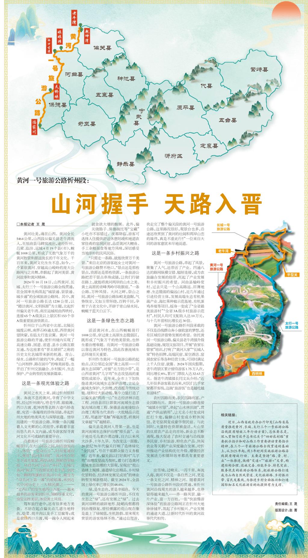 2024年10月18日,山西黃河、長城、太行三個一號旅游公路全線貫通,在全國率先構(gòu)筑起“城景通、景景通、城鄉(xiāng)通”的全域旅游公路網(wǎng)。其中,黃河一號旅游公路長達(dá)1238公里,以“踏訪黃河、文明探源”為主題,北起忻州偏關(guān)老牛灣,南至運(yùn)城垣曲西哄村,連接65個A級及以上景區(qū)和153個非A級重要旅游資源點(diǎn)。