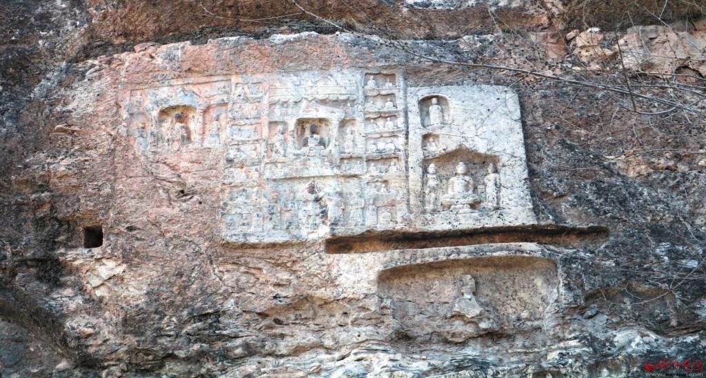 七巖山摩崖造像位于定襄縣南王鄉(xiāng)黃場峪村東南約一千米處,分布于溝兩側(cè)崖壁上。現(xiàn)存東魏、北齊和唐代摩崖造像及石窟共9處,其中石窟5處,摩崖造像4處,大小佛教造像1200余尊,造像總面積約27平方米。據(jù)《定襄金石考》記載:最早的造像及碑記為北魏神龜二年(519),現(xiàn)無存?,F(xiàn)存最早的摩崖造像及題記為東魏天平三年(536),由僧人慧端等刊刻。另有北齊天保七年(556)廣武令趙郎奴等刊刻的造像及題記,以及唐先天二年(713)造像及題記。石窟主要為佛殿窟和禪窟,造像題材包括七佛、千佛和涅槃像等。