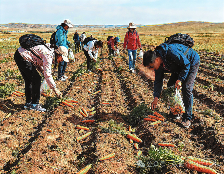 “撿秋”游演繹著“鄉(xiāng)土中國”的現(xiàn)代篇章。費(fèi)孝通在《鄉(xiāng)土中國》開篇即言“從基層上看去,中國社會是鄉(xiāng)土性的”。這種“鄉(xiāng)土性”的核心是人與土地的深度綁定。農(nóng)民靠土地生存,土地是文化認(rèn)同的根基。“撿秋”這種農(nóng)耕活動,如今以更加鮮活方式延續(xù)下來。對農(nóng)民而言,土地不僅是謀生手段,更是安身立命的“精神原鄉(xiāng)”。而城市游客的參與則賦予了“撿秋”新的意義。在城市里待久了,就想蹲在田里感受泥土的溫度,游客“撿秋”體驗(yàn)的是“春種秋收”踏實(shí)感。這種體驗(yàn)式參與是現(xiàn)代人對鄉(xiāng)土文明的“情感反哺”。游客們彎腰的身影既是對土地的致敬,也是對“根”的追尋。他們未必真懂農(nóng)事,但通過參與“撿秋”完成了對鄉(xiāng)土文化的認(rèn)同,被撿起的“果實(shí)”從“生存作物”演變?yōu)椤拔幕浇椤?。?dāng)前,內(nèi)蒙古各地推出的挖土豆、烤土豆等旅游項(xiàng)目是對鄉(xiāng)土資源的文化再“編碼”,當(dāng)土豆從田間走向游客的后備箱,“鄉(xiāng)土中國”便獲得了更加豐富的表達(dá)。