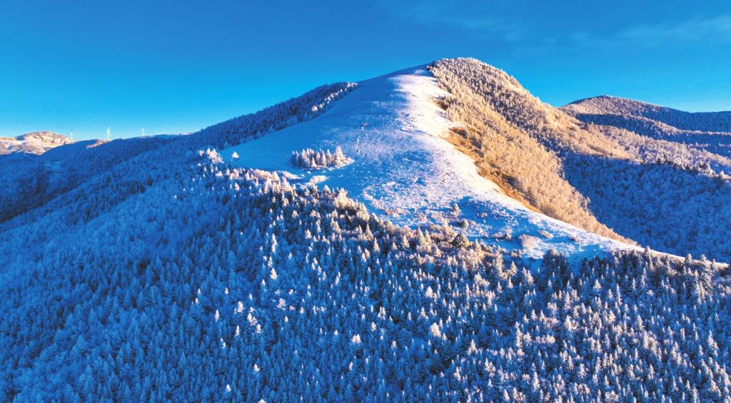 冬之凈,返璞歸真的意蘊。當一場大雪如期而至,金山梁便徹底沉靜下來,進入一個冰雕玉砌的童話世界。梁頂之上,積雪平整如鏡,宛如瓊瑤鋪地,反射著清冷而純粹的日光。而當陽光突破云層,照射在冰面上,則光芒閃耀,令人不敢直視。松枝上堆滿了蓬松的積雪,傲立于山崖,盡顯在嚴酷中堅守的堅韌品格;山間那些奇形怪狀的巖石,覆上白霜后,更是空蒙清靈,意韻悠長。生命的痕跡并未完全消失,偶有野兔為了覓食奔躍而過,在雪地上留下一串輕盈的足跡,但轉(zhuǎn)瞬便被新雪覆蓋,似乎了無痕跡;時有耐寒的鳥兒掠崖飛去,翅羽間振落的冰晶,在空中劃出一道優(yōu)美的弧線。