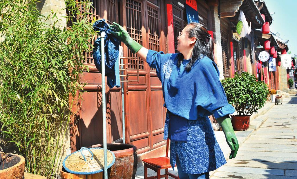 趙慧的藍染缸是金貴的,但她并不藏私,只要有人愿意學,她總是歡喜接納。來到古城之后,她開展了很多次藍染體驗活動,大人和孩子們戴上手套,穿好工作服,來到染缸前,把自己親手扎好或畫好的白布放進去,起先出來是綠色,然后是淺藍、深藍,最后得到一塊有白色花紋和圖案的藍染作品。趙慧愿意把藍染的樂趣和神奇與更多的人分享,因為她懂得,只有讓更多的人了解和知道,天然染這項古老的技藝才能傳承下去,而不會丟失在時光里。
