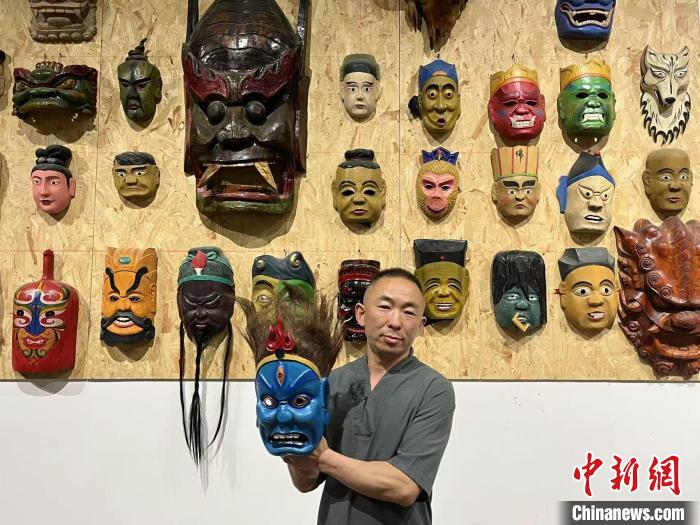 5月4日,湖北恩施州級(jí)非物質(zhì)文化遺產(chǎn)儺面具制作技藝代表性傳承人汪儒斌展示他做的儺面具。中新社記者 武一力 攝