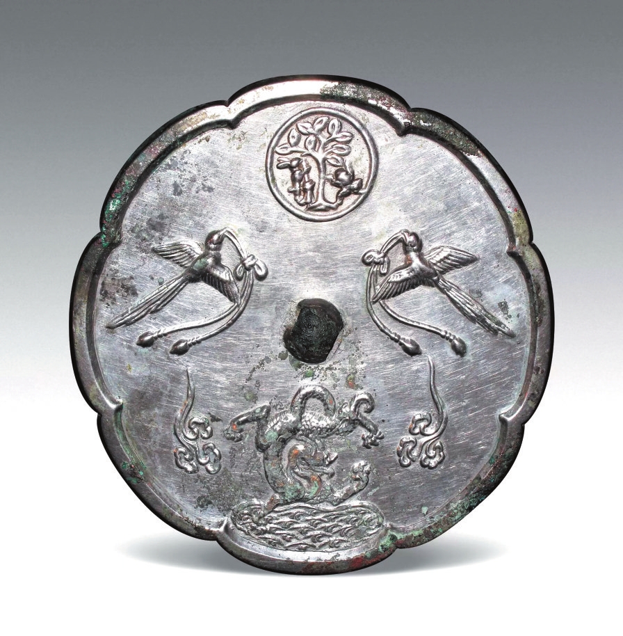 唐代張匯的《千秋鏡賦》云,千秋鏡背“或鑄或镕,是磨是削??桃詾辇垼U以成鵲”,《文苑英華》亦載“鵲飛如向月,龍盤(pán)以映池”,與盤(pán)龍雙鵲月宮鏡上的紋飾恰好相符。盤(pán)龍、雙鵲、祥云,月宮中的玉兔、蟾蜍、桂樹(shù),成為此類(lèi)銅鏡的畫(huà)面主體,引發(fā)人們對(duì)月宮的美好想象。