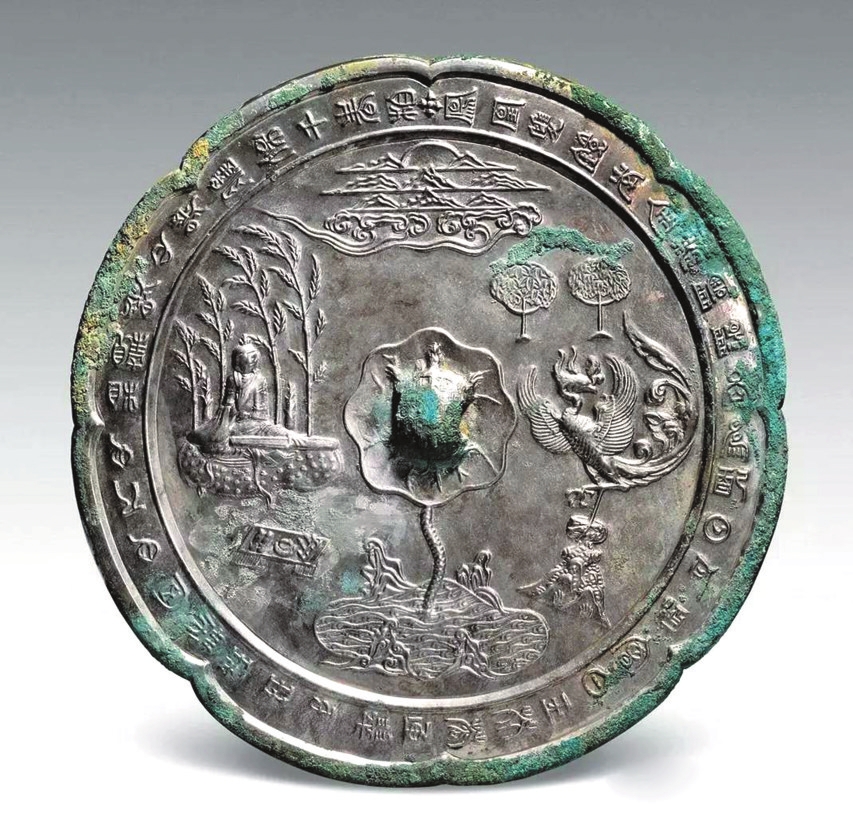 真子飛霜鏡一般都是圓形、葵花形,而西安出土的一面鏡形十分罕見(jiàn),為亞字形。鏡背上方云海托月,半個(gè)月亮浮上來(lái)。真子飛霜鏡的形制,多在細(xì)節(jié)上略有差異。除了鏡鈕上方有“真子飛霜”四字,或者有一只飛翔的仙鶴之外,還有一種在鏡緣飾篆書(shū)體銘文,鏡銘為:“鳳凰雙鏡南金裝。陰陽(yáng)各為配,日月恒相會(huì)。白玉芙蓉匣,翠羽瓊瑤帶。同心人,心相親,照心照膽保千春?!?/p>