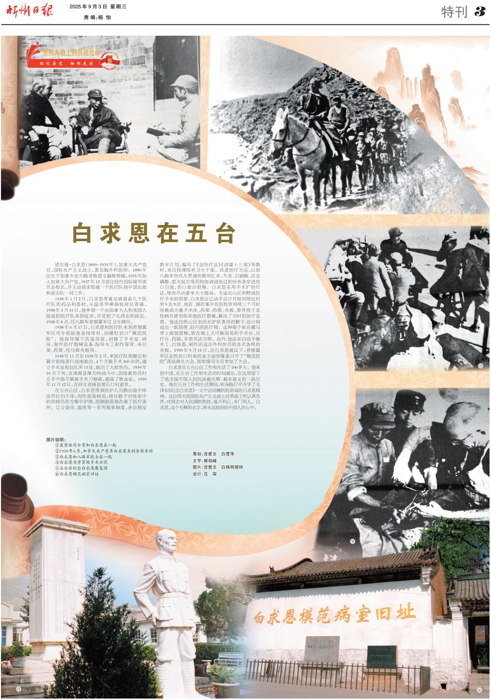 白求恩在五臺山區(qū)工作和生活了100多天。他來到中國,在五臺工作和生活的時間最長,在這里留下了他支援中國人民抗戰(zhàn)最光輝、最有意義的一段歷史。他在五臺工作和生活期間,躬身踐行并升華了毛澤東《紀念白求恩》一文中總結(jié)概括的崇高的白求恩精神。這位偉大的國際共產(chǎn)主義戰(zhàn)士對革命工作認真負責,對同志對人民滿腔熱忱,毫不利己,專門利人。白求恩,這個光輝的名字,將永遠銘刻在中國人民心中。