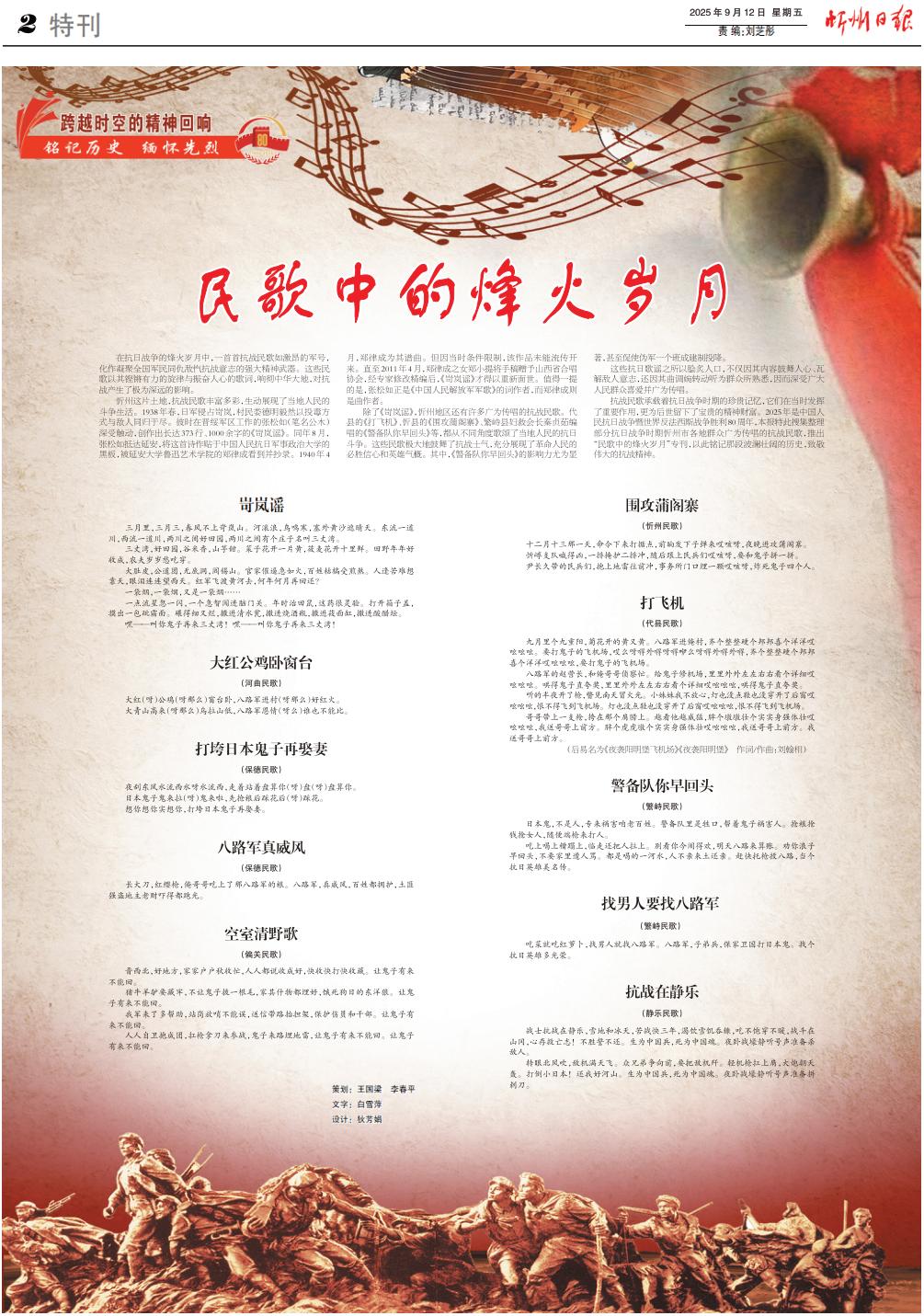 在抗日戰(zhàn)爭(zhēng)的烽火歲月中,一首首抗戰(zhàn)民歌如激昂的軍號(hào),化作凝聚全國軍民同仇敵愾抗戰(zhàn)意志的強(qiáng)大精神武器。這些民歌以其鏗鏘有力的旋律與振奮人心的歌詞,響徹中華大地,對(duì)抗戰(zhàn)產(chǎn)生了極為深遠(yuǎn)的影響。 忻州這片土地,抗戰(zhàn)民歌豐富多彩,生動(dòng)展現(xiàn)了當(dāng)?shù)厝嗣竦亩窢?zhēng)生活。1938年春,日軍侵占岢嵐,村民婁德明毅然以投毒方式與敵人同歸于盡。彼時(shí)在晉綏軍區(qū)工作的張松如(筆名公木)深受觸動(dòng),創(chuàng)作出長(zhǎng)達(dá)373行、1000余字的《岢嵐謠》。同年8月,張松如抵達(dá)延安,將這首詩作貼于中國人民抗日軍事政治大學(xué)的黑板,被延安大學(xué)魯迅藝術(shù)學(xué)院的鄭律成看到并抄錄。1940年4月,鄭律成為其譜曲。但因當(dāng)時(shí)條件限制,該作品未能流傳開來。直至2011年4月,鄭律成之女鄭小提將手稿贈(zèng)予山西省合唱協(xié)會(huì),經(jīng)專家修改精編后,《岢嵐謠》才得以重新面世。值得一提的是,張松如正是《中國人民解放軍軍歌》的詞作者,而鄭律成則是曲作者。 除了《岢嵐謠》,忻州地區(qū)還有許多廣為傳唱的抗戰(zhàn)民歌。代縣的《打飛機(jī)》、忻縣的《圍攻蒲閣寨》、繁峙縣婦救會(huì)長(zhǎng)秦貞茹編唱的《警備隊(duì)你早回頭》等,都從不同角度歌頌了當(dāng)?shù)厝嗣竦目谷斩窢?zhēng)。這些民歌極大地鼓舞了抗戰(zhàn)士氣,充分展現(xiàn)了革命人民的必勝信心和英雄氣概。其中,《警備隊(duì)你早回頭》的影響力尤為顯著,甚至促使偽軍一個(gè)班成建制投降。 這些抗日歌謠之所以膾炙人口,不僅因其內(nèi)容鼓舞人心、瓦解敵人意志,還因其曲調(diào)婉轉(zhuǎn)動(dòng)聽為群眾所熟悉,因而深受廣大人民群眾喜愛并廣為傳唱。 抗戰(zhàn)民歌承載著抗日戰(zhàn)爭(zhēng)時(shí)期的珍貴記憶,它們?cè)诋?dāng)時(shí)發(fā)揮了重要作用,更為后世留下了寶貴的精神財(cái)富。2025年是中國人民抗日戰(zhàn)爭(zhēng)暨世界反法西斯戰(zhàn)爭(zhēng)勝利80周年,本報(bào)特此搜集整理部分抗日戰(zhàn)爭(zhēng)時(shí)期忻州市各地群眾廣為傳唱的抗戰(zhàn)民歌,推出“民歌中的烽火歲月”??源算懹浤嵌尾憠验煹臍v史,致敬偉大的抗戰(zhàn)精神。 岢嵐謠 三月里,三月三,春風(fēng)不上岢嵐山。河滾浪,鳥鳴寒,塞外黃沙遮晴天。東流一道川,西流一道川,兩川之間好田園,兩川之間有個(gè)莊子名叫三丈灣。 三丈灣,好田園,谷米香,山芋甜。菜子花開一片黃,莜麥花開十里鮮。田野年年好收成,農(nóng)夫歲歲愁吃穿。 大肚皮,公道團(tuán),無底洞,閻錫山。官家催逼急如火,百姓枯槁受煎熬。人逢苦難想靠天,眼淚連連望西天。紅軍飛渡黃河去,何年何月再回還? 一袋煙,一袋煙,又是一袋煙…… 一點(diǎn)流星忽一閃,一個(gè)急智闖進(jìn)腦門關(guān)。年時(shí)治田鼠,這藥很靈驗(yàn)。打開箱子蓋,摸出一包砒霜面。碾得細(xì)又爛,撒進(jìn)清水甕,撒進(jìn)燒酒瓶,撒進(jìn)莜面缸,撒進(jìn)酸醋壇。 嘿——叫你鬼子再來三丈灣!嘿——叫你鬼子再來三丈灣! 大紅公雞臥窗臺(tái) (河曲民歌) 大紅(呀)公雞(呀那么)窗臺(tái)臥,八路軍進(jìn)村(呀那么)好紅火。 大青山高來(呀那么)烏拉山低,八路軍恩情(呀么)誰也不能比。 打垮日本鬼子再娶妻 (保德民歌) 夜刮東風(fēng)水流西水呀水流西,走著站著盤算你(呀)盤(呀)盤算你。 日本鬼子鬼來拉(呀)鬼來啦,先搶糧后踩花后(呀)踩花。 想你想你實(shí)想你,打垮日本鬼子再娶妻。 八路軍真威風(fēng) (保德民歌) 長(zhǎng)大刀,紅纓槍,俺哥哥吃上了那八路軍的糧。八路軍,真威風(fēng),百姓都擁護(hù),土匪強(qiáng)盜地主老財(cái)嚇得都跑光。 空室清野歌 (偏關(guān)民歌) 晉西北,好地方,家家戶戶秋收忙,人人都說收成好,快收快打快收藏。讓鬼子有來不能回。 豬牛羊驢要藏牢,不讓鬼子拔一根毛,家其什物都埋好,餓死狗日的東洋狼。讓鬼子有來不能回。 我軍來了多幫助,站崗放哨不能誤,送信帶路抬擔(dān)架,保護(hù)傷員和干部。讓鬼子有來不能回。 人人自衛(wèi)抱成團(tuán),扛槍拿刀來參戰(zhàn),鬼子來路埋地雷,讓鬼子有來不能回。讓鬼子有來不能回。 圍攻蒲閣寨 (忻州民歌) 十二月十三那一天,命令下來打據(jù)點(diǎn),前晌發(fā)下子彈來哎咳呀,夜晚進(jìn)攻蒲閣寨。 忻崞支隊(duì)喊得兇,一排掩護(hù)二排沖,隨后跟上民兵們哎咳呀,要和鬼子拼一拼。 尹長(zhǎng)久帶的民兵們,抱上地雷往前沖,事務(wù)所門口埋一顆哎咳呀,炸死鬼子四個(gè)人。 打飛機(jī) (代縣民歌) 九月里個(gè)九重陽,菊花開的黃又黃。八路軍進(jìn)俺村,齊個(gè)整整硬個(gè)邦邦喜個(gè)洋洋哎吆吆吆。要打鬼子的飛機(jī)場(chǎng),哎么呀嘚外嘚呀嘚咿么呀嘚外嘚外嘚,齊個(gè)整整硬個(gè)邦邦喜個(gè)洋洋哎吆吆吆,要打鬼子的飛機(jī)場(chǎng)。 八路軍的趙營長(zhǎng),和俺哥哥偵察忙。給鬼子修機(jī)場(chǎng),里里外外左左右右看個(gè)詳細(xì)哎吆吆吆。哄得鬼子直夸獎(jiǎng),里里外外左左右右看個(gè)詳細(xì)哎吆吆吆,哄得鬼子直夸獎(jiǎng)。 聽的半夜開了槍,瞥見南天冒火光。小妹妹我不放心,燈也沒點(diǎn)鞋也沒穿開了后窗哎吆吆吆,恨不得飛到飛機(jī)場(chǎng)。燈也沒點(diǎn)鞋也沒穿開了